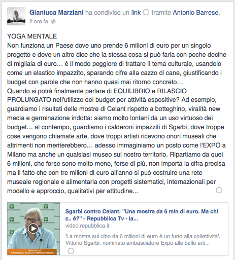 Nelle stesse ore, un noto curatore di arti visive, Gianluca Marziani, rilancia una polemica nota tra Sgarbi e Celant, in cui il primo rimprovera al secondo di fruire di circa sei milioni di euro per organizzare esposizioni nel contesto dell’EXPO di Milano, con tutte le polemiche che ne conseguono. Vero o non vero che sia, Sgarbi spiega di poter fare con molto meno. Marziani mette in risalto un “elastico impazzito”, che corre dall’ipotesi di destinare milioni di euro fino a poche decine di migliaia per lo stesso evento, attraverso nomi noti e meno noti. Se a questo, aggiungiamo le considerazioni che derivano da un bando che chiede agli artisti, oltre alla gratuità, di assumersi i costi degli oneri sociali e un’assicurazione su eventuali danni a terzi; l’improvvisa e repentina scadenza (tre giorni) data dal Comune agli occupanti del Teatro Valle dopo tre anni di assoluto silenzio, il panorama è disarmante, ma la misura non è colma.