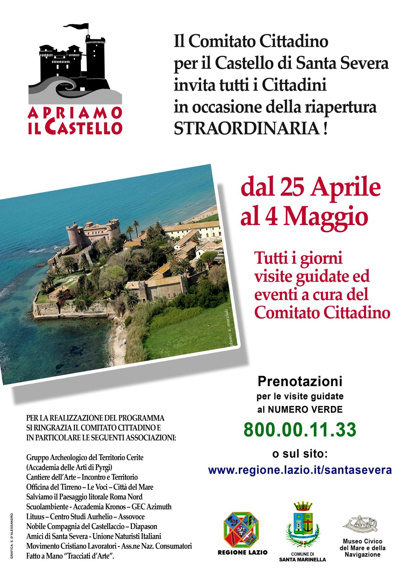 Un programma di attività e manifestazioni culturali. Andrà avanti nei dieci giorni di apertura del Castello, dal 25 aprile al 4 maggio. È stato possibile realizzarlo anche grazie all’impegno e alla collaborazione delle oltre 40 associazioni del Comitato Cittadino per il Castello di Santa Severa.