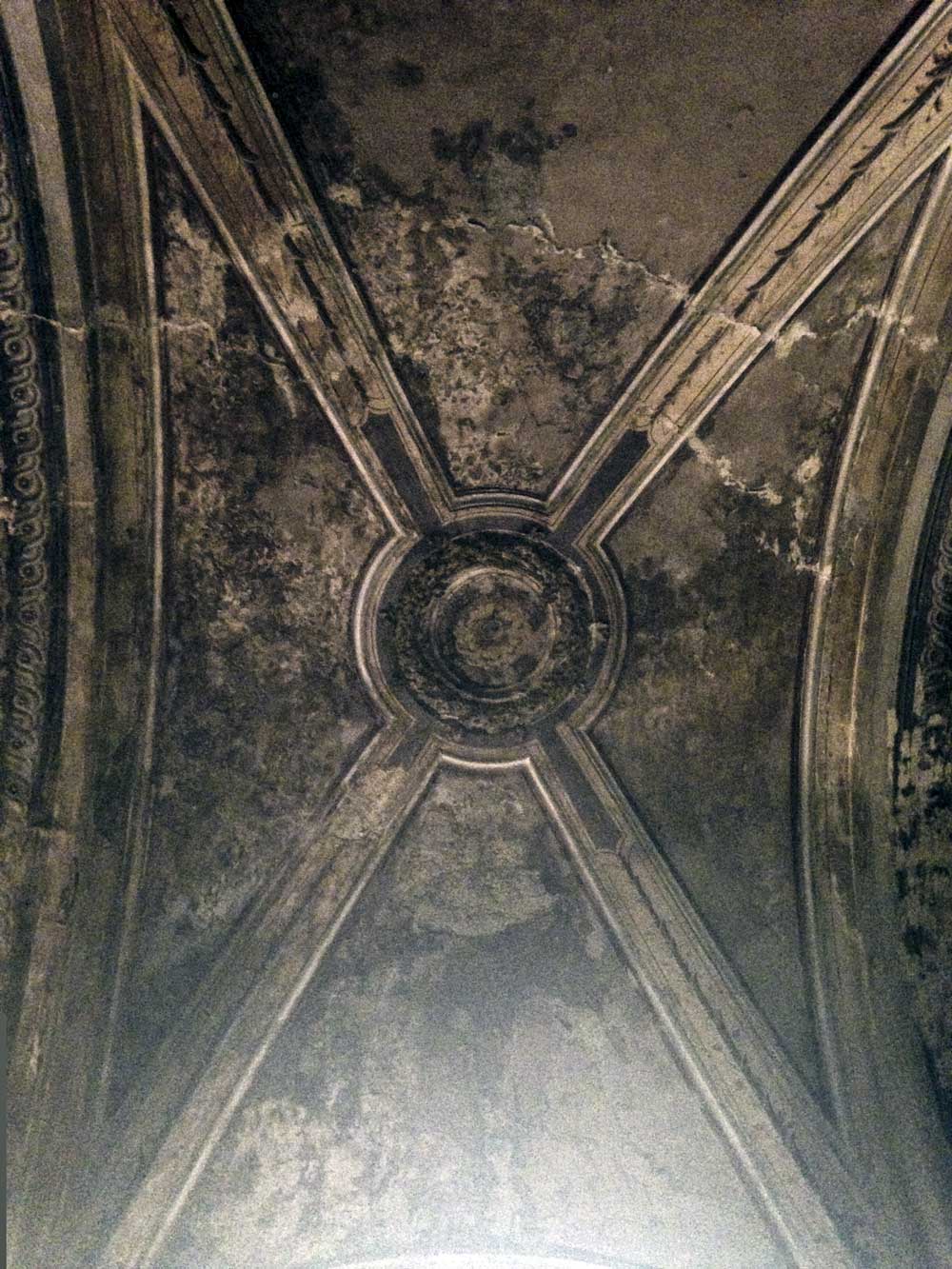 Ovunque infiltrazioni di acque meteoriche provenienti dal solaio di copertura che hanno causato il distacco di porzioni di intonaci dipinti e persino l’insorgenza nefasta di muffe apparentemente insalubri.