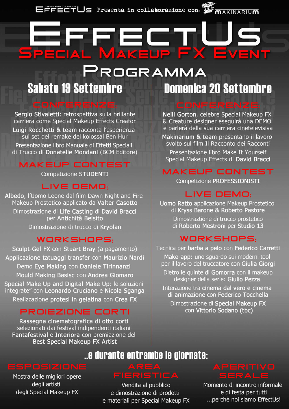 L’idea di EFFECTUS nasce in risposta ad una necessità sorta tra i professionisti e gli amatori di condivisione di tecniche artistiche ed esperienze. L’evento proposto vuole essere un momento di incontro, uno scambio culturale ed artistico tra colleghi e appassionati di Special Make-up Effects. Oltre ad una sezione formativa arricchita da WORKSHOP, CONFERENZE, PROIEZIONI MAKE-UP CONTEST e MOSTRE, l’Evento è pensato anche per includere una sezione FIERISTICA che riunirà molti brand specializzati del settore nazionali ed internazionali ed istituti di formazione.