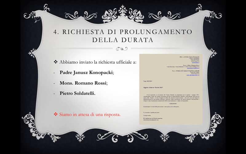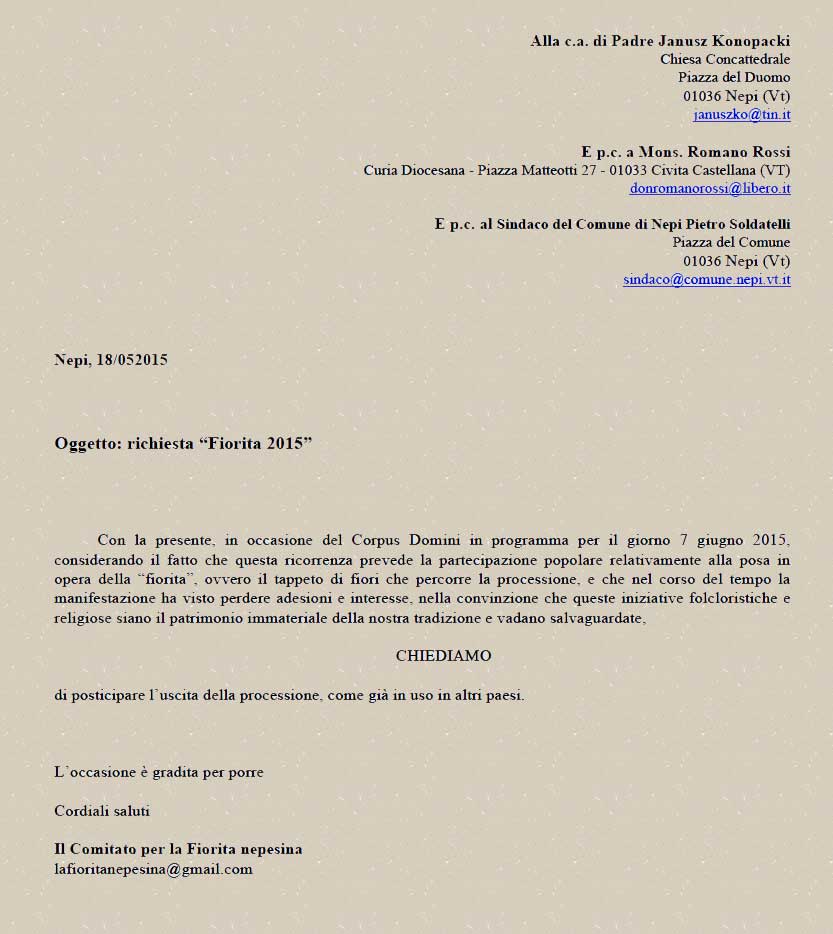 4. richiesta formale al parroco, al vescovo e al sindaco di prendere in seria considerazione l’idea di far durare di più l’evento, posticipando l’orario della processione e permettendo così a un maggior numero di persone di beneficiare dell’avvenimento, come già in uso in altri paesi del territorio (segue immagine della lettera inviata).