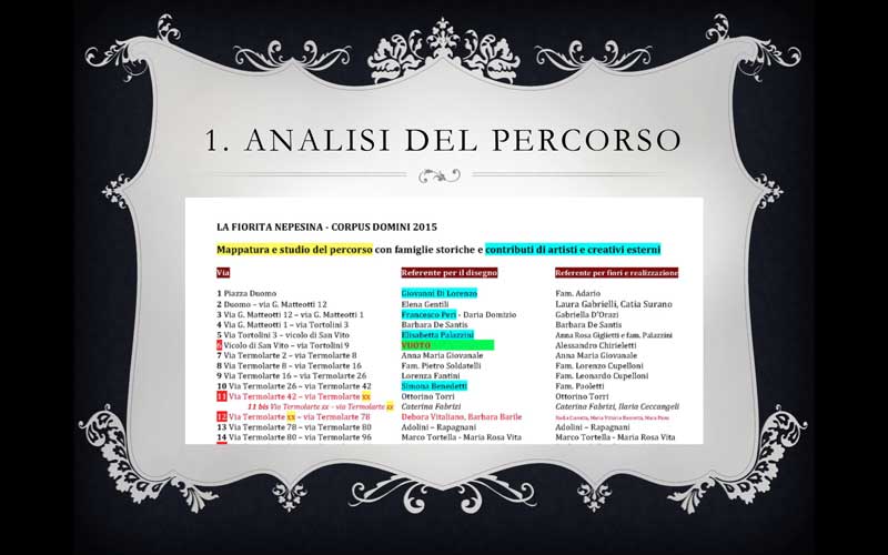 1. mappatura del percorso: numeo civico per numero civico, stiamo cercando di capire CHI DISEGNA e CHI POSA IN OPERA il materiale floreale (vedi immagine);