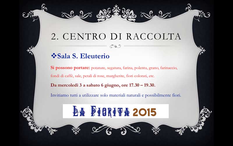 – contribuire con piccole donazioni di materiali come farina, polenta, grano, farinaccio, sale, potature già sfogliate, segatura, margherite, rose (petali) e ovviamente fiori colorati (centro di raccolta S.Eleuterio).