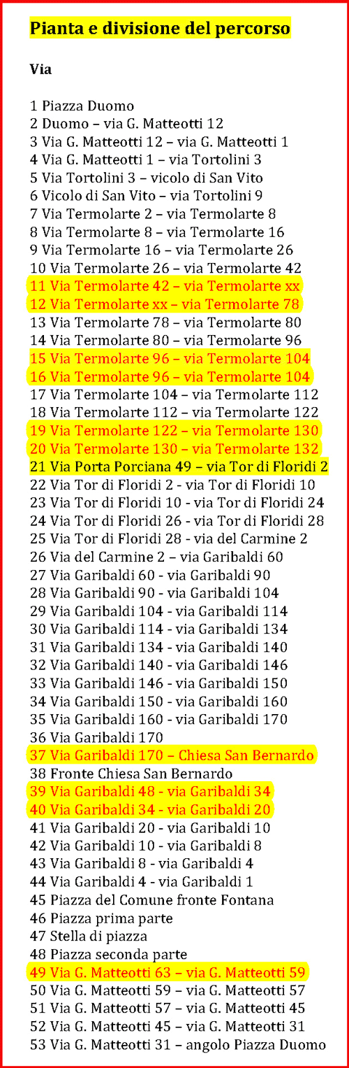 A questo scopo stiamo realizzando una mappatura, cosa mai fatta prima a Nepi, ma per essere il più possibile vicini alla verità dello stato dell’arte, facciamo un appello: leggi la divisione del percorso che abbiamo pubblicato (disponobile anche a S. Eleuterio nei giorni sotto indicati), via per via, numero civico per numero civico.