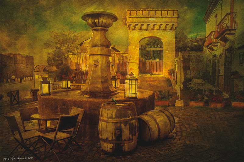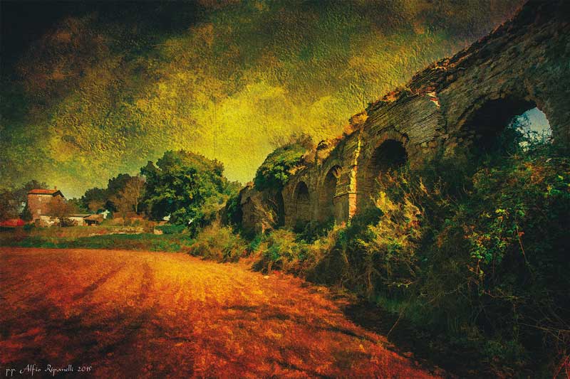 Il resto del lavoro è ultimato dall’autore davanti al computer ed equivale al tempo impegnato dietro i suoi scatti, a passeggio tra gli anditi dispersi del territorio. Lì, in ore solitarie di fronte a un monitor, si svolge il compito attento dell’artigiano. Sì, perché si può mantenere viva tutta la creatività artigianale anche lavorando con i nuovi mezzi tecnologici e multimediali. Ecco allora che la scelta dello scatto giusto, la manipolazione con diversi programmi informatici, le scale cromatiche e gli effetti rubati alle ore di sonno, si sovrappongono al lavoro fatto dai piedi tra le forre. Così, Nepi e il suo territorio sono prima catturati dall’obiettivo fotografico, poi trasformati dalle ore di lavoro certosino davanti al computer. Ore e ore di manipolazione grafica per ottenere i risultati che vediamo, ammirati in queste stampe di piccolo e medio formato: scatti digitali proposti su pannelli di forex che del territorio di Nepi ci regalano intatta tutta la meraviglia del viaggiatore che si trova per la prima volta davanti ai panorami agresti, un po’ come capitava per i viaggiatori di fine ‘800. E di quel periodo i lavori di Alfio conservano intatta tutta l’allure pittorica: talvolta sembra di essere davanti a un paesaggio dei macchiaioli, tal altra pare di vedere immagini pre-impressioniste. Nulla di tutto questo: nessun pennello, niente colori della tavolozza acrilica o del più nobile pigmento a olio; piuttosto si tratta di effetti ben calibrati al computer, che della pittura evocano il gusto, il sentimento e le paste cromatiche.