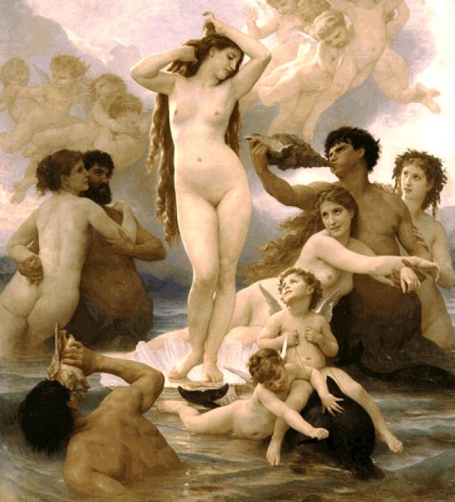 L’Arte ci parla per immagini attivando le nostre emozioni, le nostre conoscenze, i nostri sentimenti, ci dà nuovi spunti non omologati per guardare il mondo, differenti punti di osservazione sulla realtà, e ci dice tante cose, molte delle quali – essendo l’Arte un linguaggio – si devono conoscere e, se non si conoscono, si possono imparare… Per esempio: la Venere di Botticelli è emblema di perfezione perché sovrapponibile, nell’anatomia, a una colonna, che allora era tornata ad essere emblema di equilibrio e purezza; quindi, in quanto colonna, lo scheletro della Venere, che la dovrebbe sostenere, è sballato, non è credibile; infatti, la giovane ha spalle troppo scese, braccia lunghissime come lo è il collo e, a ben guardare, anche il piede non è nella posizione prospettica giusta… Eppure funziona. E’ bella. Tale bellezza ci è ancor più evidente sapendo che essa rispecchia i dettami della filosofia di Marsilio Ficino (pieni i simboli neoplatonici nella composizione!) che giungono sino a noi rinnovati da una lettura più contemporanea. Data per certa l’imperfezione fisica ma la perfezione filosofica di questa Venere dai riccioli rossi, passiamo alla sua carica erotica. Pensiamo a quanto è conturbante quella di Bouguereau e siamo certi che questa sua olimpica mora dai lunghi capelli batta la collega rinascimentale. Poi scopriamo che la spuma da cui emerge (nasce) la fiorentina altro non è che lo sperma del dio che feconda e… dubitiamo di quale delle due dee sia la più esplicitamente sensuale.