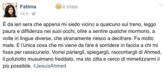 “È da ieri sera che appena mi siedo vicino a qualcuno sul treno, leggo paura e diffidenza nei suoi occhi, oltre a sentire qualche mormorio, a volte in lingue diverse, che stranamente riesco a decifrare. Fa molto male. E l’unica cosa che mi viene da fare è sorridere in faccia a chi mi fissa per rassicurarlo. Vorrei parlargli, spiegargli, raccontargli di Ahmed, il poliziotto musulmano freddato, ma sto zitta e cerco di mimetizzarmi il più possibile” (Fatima K.).