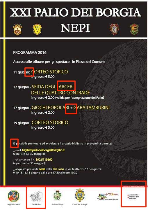 Quest’anno le polemiche non si sono fatte attendere, come ben sa chi conosce i nepesini nel profondo del loro modo di essere, complice la frenesia della preparazione e degli accorgimenti dell’ultima ora, che non si sposano ancora con una programmazione ben ponderata a tavolino e studiata ad arte. Ecco allora che si passa dalla stampa di un programma che sembra più l’elenco telefonico delle attività del territorio (a proposito, dov’è il programma?!), a locandine con dubbi errori di ortografia, dove se non altro dispiace vedere il buon nome dell’Accademia delle Belle Arti di Roma speso con tanta leggerezza, dato l’abuso di imperizie, all’uso di fotografie e immagini di ragazzi chiamati per l’occasione a tamponare la falla che si è venuta a creare per l’indisponibilità delle immagini appartententi a fotografi di lungo corso, ad affrettati concorsi con premi risibili, a impostazioni discutibili sia da un punto di vista squisitamente storico, che estetico.