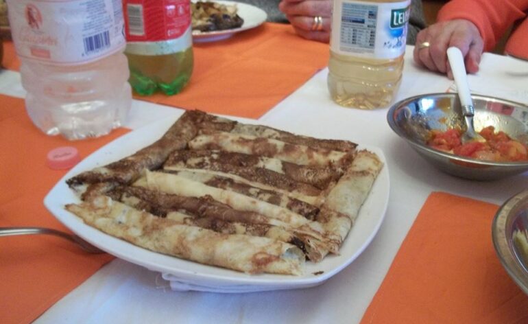 Procedimento: in una pentola abbastanza alta mettere le uova, sbatterle e aggiungere il latte e il pizzico di sale. Aggiungere man mano la farina, sempre sbattendo, magari con una frusta elettrica. Aggiungere acqua quanto basta per creare un composto pastellato quasi liquido. Non si devono creare grumi; nel caso, va passata. Si lascia riposare il composto per 10 minuti. Nel frattempo si fa bollire l’olio d’oliva in un pentolino e si preparano un paio di padelle uguali di diametro. Si mette un cucchiaio di olio bollente in ogni padella e poi si rimette nel pentolino, una volta oliata la padella. Immediatamente si mette poco composto con un mestolino piccolo e si gira in tutta la padella in modo che si formi una “frittatina” molto sottile, quasi trasparente. Si fa cuocere e poi si rigira dall’altra parte, o con le mani o facendo saltare la padella. Si fa cuocere dall’altra parte, molto velocemente, il tutto in 2 minuti massimo. Si depongono su un piatto e si procede a farne altri.