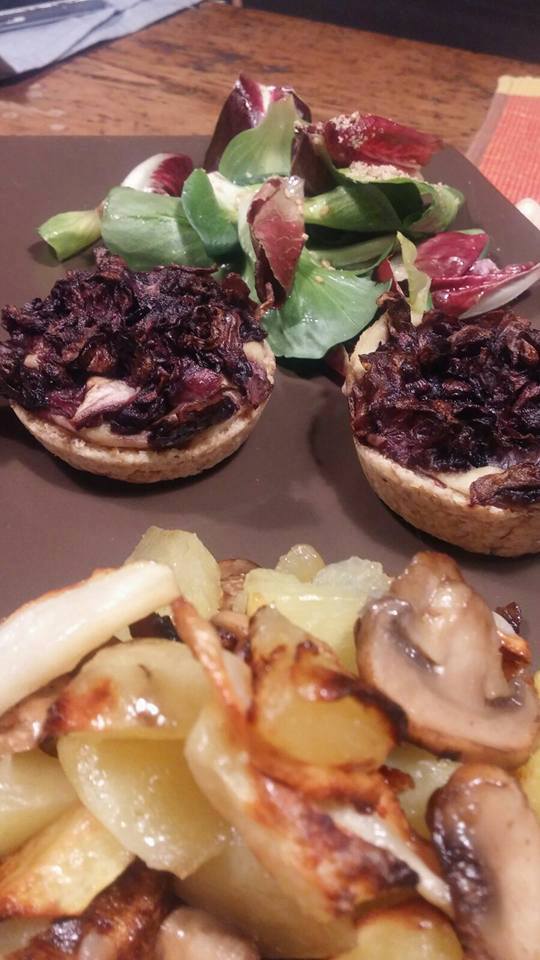 Tartellette integrali al radicchio e crema di ceci, insalatina, patate al forno con topinambur e funghi.