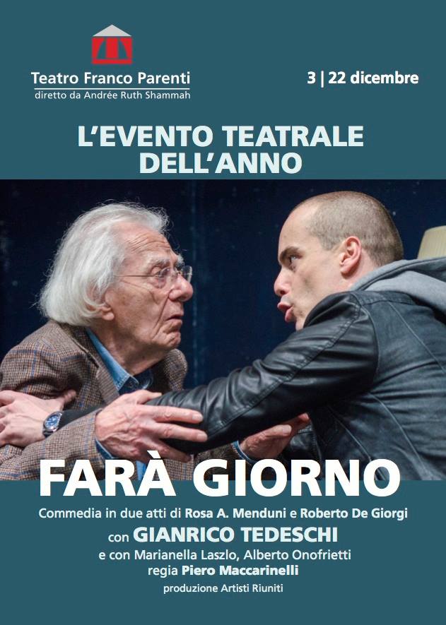 Dopo il grande successo della passata stagione, Gianrico Tedeschi torna a commuovere il pubblico con la commedia Farà giorno di Rosa A. Menduni e Roberto De Giorgi, nei panni di un anziano ex partigiano alle prese con un fascistello “impunito” della periferia romana interpretato dal bravissimo Alberto Onofrietti. Con Marianella Laszlo, regia di Piero Maccarinelli, prod. Artisti Riuniti.