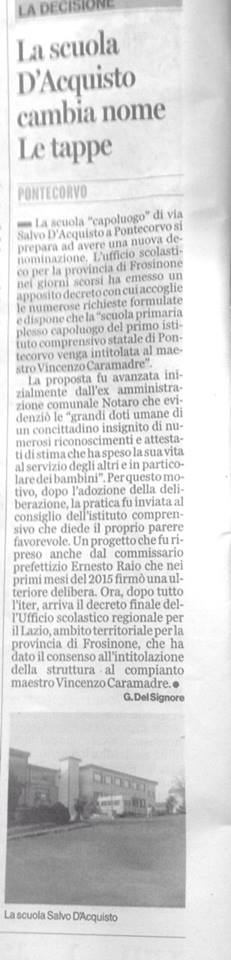 Grazie a una raccolta firme inviata agli uffici scolastici provinciale e regionale, partecipata dai suoi ex alunni, genitori e colleghi, oltre che dall’amministrazione, la scuola elementare (primaria; ndr.) del primo istituto comprensivo statale di Pontecorvo (Fr) sarà intitolata al maestro Vincenzo Caramadre.